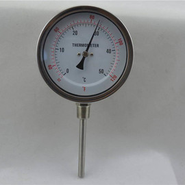 雙金屬溫度計是一種適合測量中,低溫的現(xiàn)場檢測儀表,可用來直接測量液化、氣體的溫度。雙金屬溫度計與國內(nèi)同類產(chǎn)品的比較:儀表精度等級達(dá)到1.0級,儀表上殼采用防腐材料,其耐溫性可以高達(dá)200℃,最低為-40℃。法蘭式結(jié)構(gòu),雙層密封膠圈,故防腐,防水性能好。保護(hù)管焊接采用全自動氬氣保護(hù)管、焊縫牢固、晶間腐蝕小。標(biāo)度盤是鋁氧化印刷盤,表面清晰式樣美觀。指針為內(nèi)可調(diào)式。雙金屬溫度計有軸向型,徑向型,萬向型等表頭型號選擇.雙金屬溫度計探桿長度可以根據(jù)客戶需要來定制。